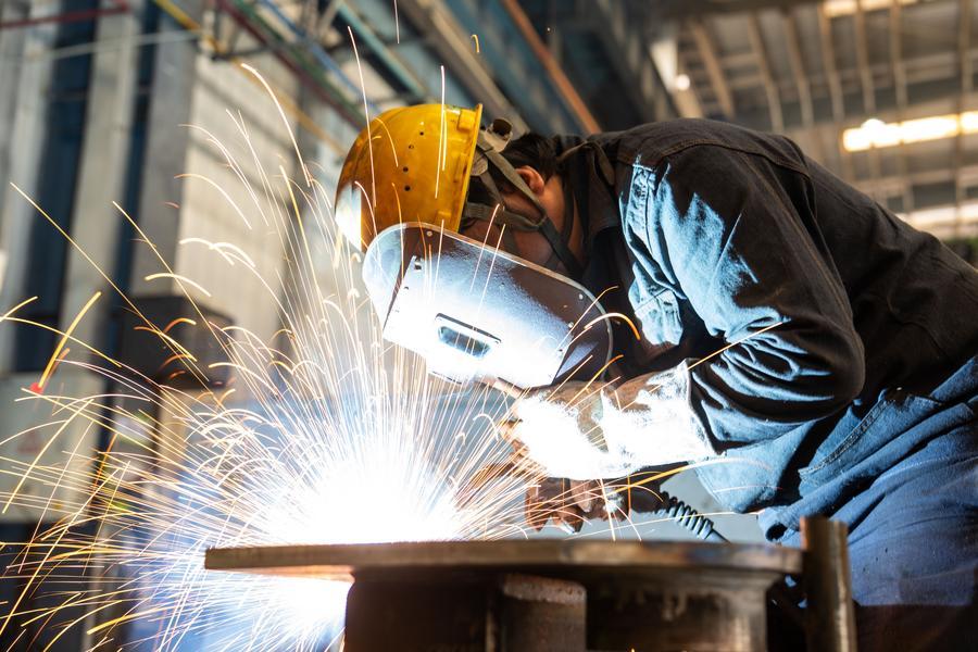 14日、建設機器メーカーの中聯重科建築起重機械で、タワークレーンの部品を製造する従業員。(長沙=新華社記者/陳思汗)