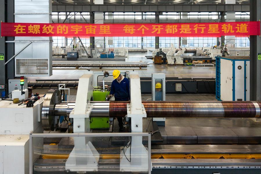 14日、油圧シリンダーメーカーの湖南特力液圧で、大型シリンダーを製造する従業員。(ドローンから、長沙=新華社記者/陳思汗)