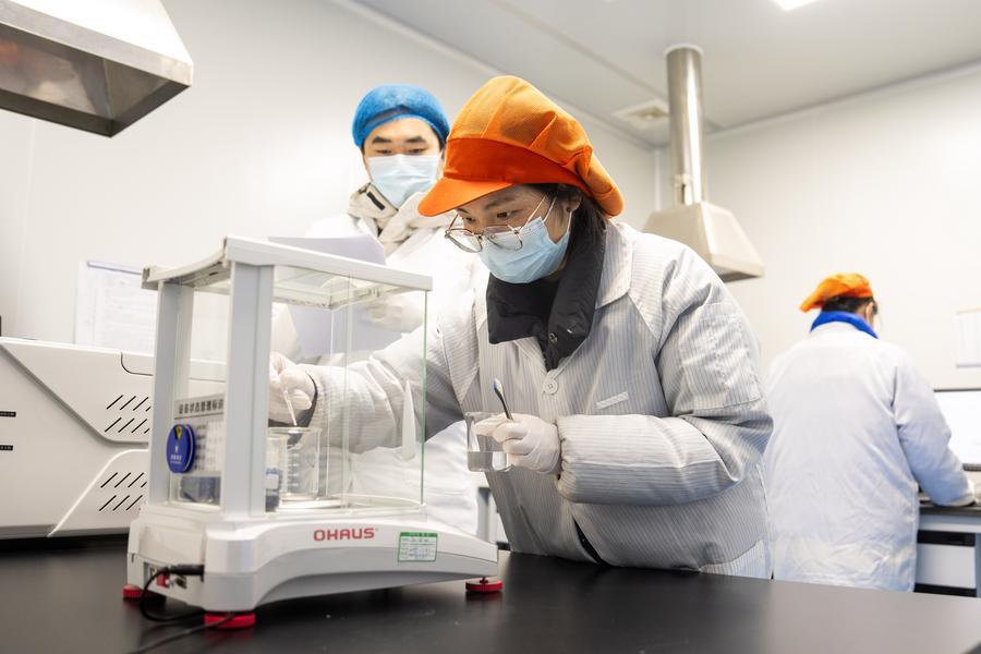 14日、バイオテクノロジー企業の湖南有美生物科技で、医療用ジェルの原料となるタンパク質の含有量を検査する従業員。(長沙=新華社記者/陳思汗)
