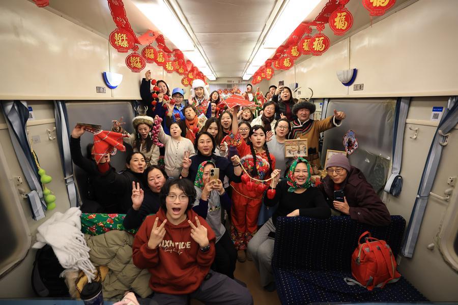 19日、K7041東北民俗テーマ列車で撮影を楽しむ外国人ツアー客。(ハルビン=新華社配信/徐率)