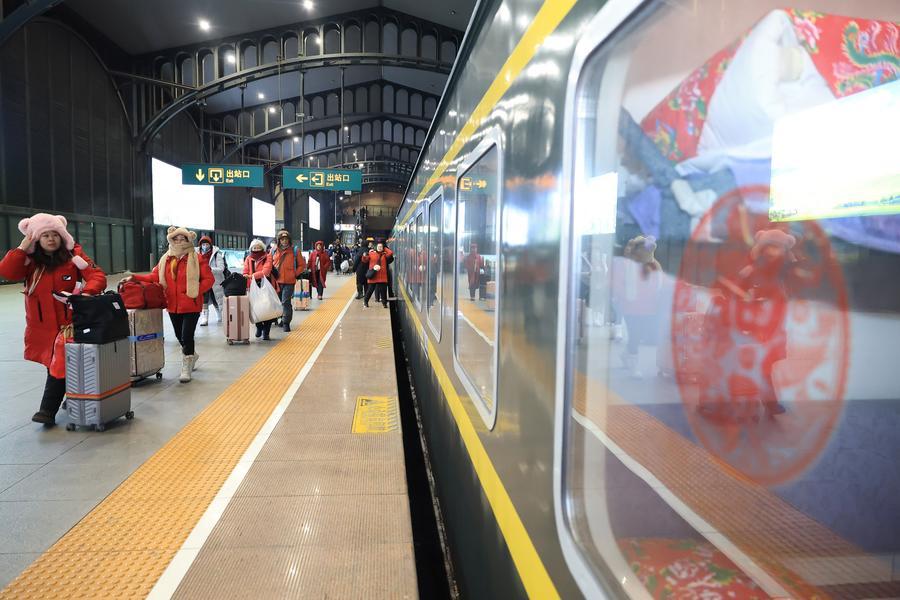 19日、K7041東北民俗テーマ列車に乗り込む外国人ツアー客。(ハルビン=新華社配信/徐率)