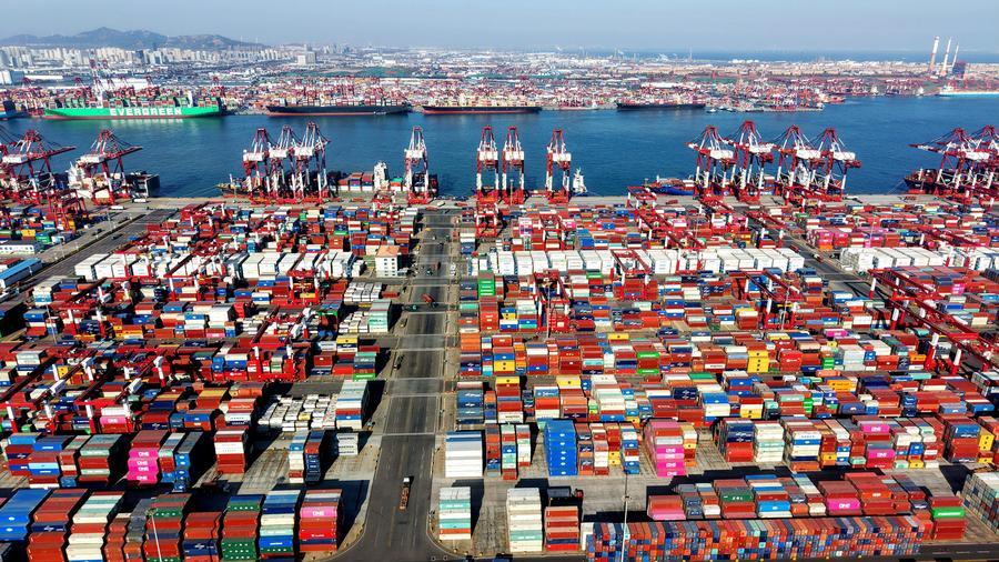 山東省・青島港の外貿コンテナふ頭。(2025年12月1日、ドローンから、青島=新華社配信/兪方平)