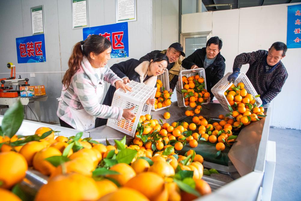 6日、重慶市墊江県包家鎮のかんきつ園で、スマート設備を使って洗浄・選別作業をする農家の人。(重慶=新華社記者/唐奕)