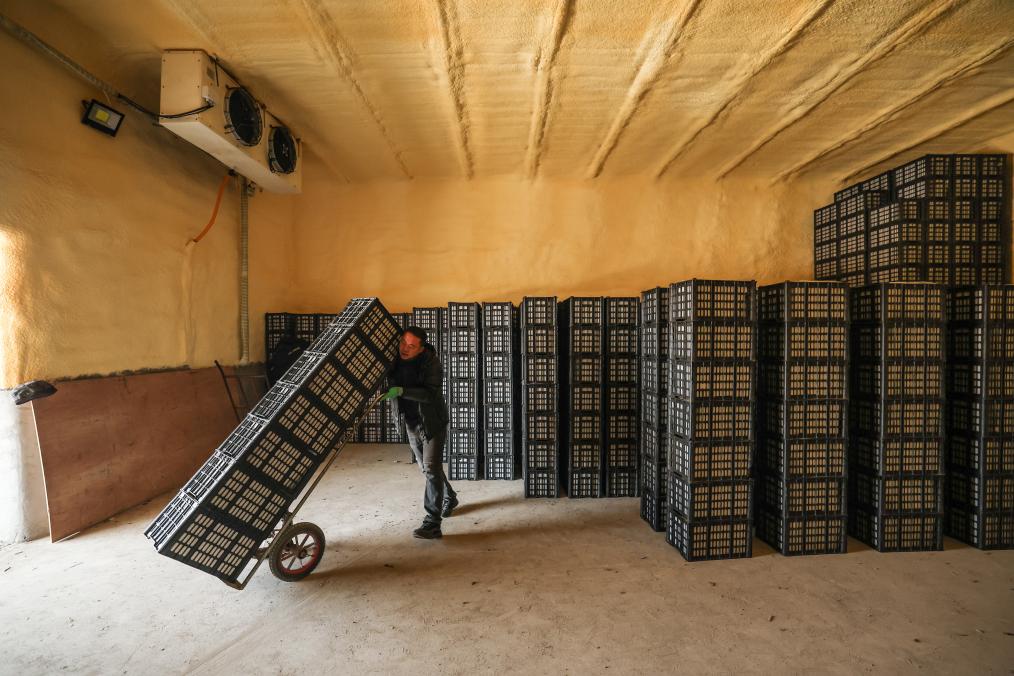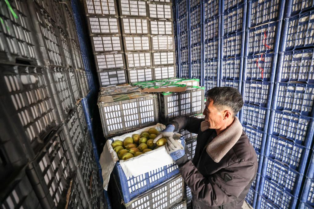 20日、祝家溝村に新たに建設された定温倉庫で出荷用果物を運ぶ住民。(葫蘆島=新華社記者/潘昱竜)