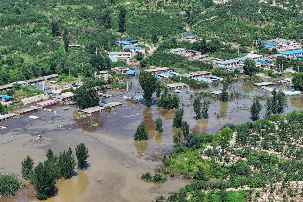 洪水に見舞われた綏中県祝家溝村。(2024年8月22日撮影、葫蘆島=新華社配信/楊歓)