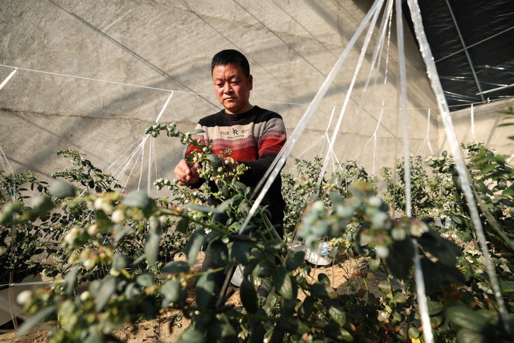 20日、祝家溝村に新たに建設されたブルーベリー栽培用温室で苗木の世話をする住民。(葫蘆島=新華社記者/潘昱竜)