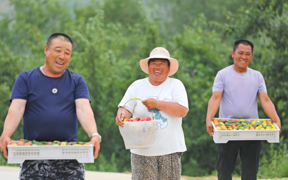 綏中県祝家溝村の果樹園でスモモを収穫する住民。(2025年7月2日撮影、葫蘆島=新華社配信/田嘉)