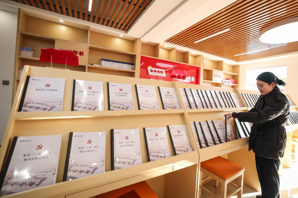 20日、祝家溝村党群サービスセンターの活動室で展示資料を整理する同村の王麗麗(おう・れいれい)共産党支部書記。(葫蘆島=新華社記者/潘昱竜)