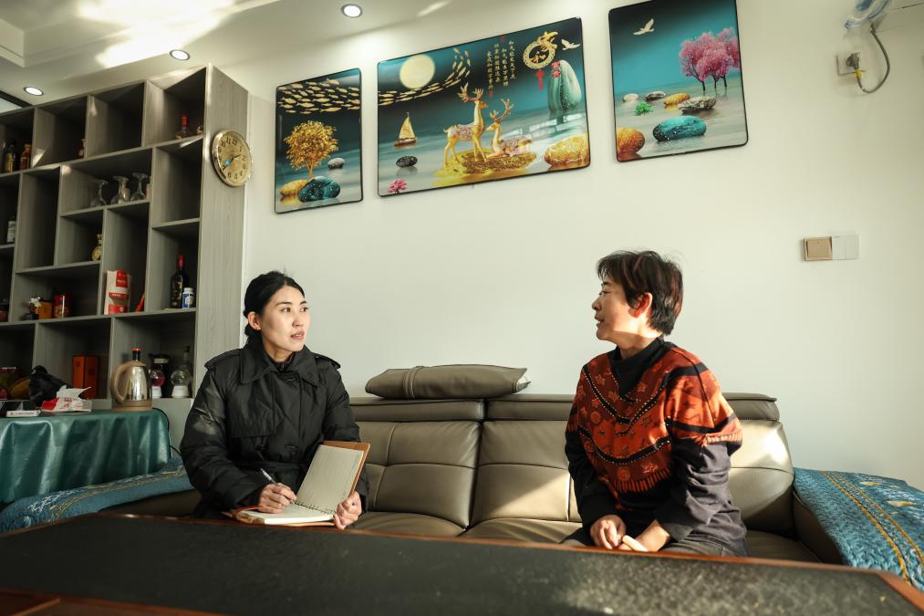 20日、住民の家を訪問し最近の生活状況を調査する祝家溝村の王麗麗(おう・れいれい)共産党支部書記(左)。(葫蘆島=新華社記者/潘昱竜)