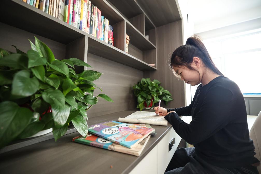 20日、自宅で宿題をする住民。(葫蘆島=新華社記者/潘昱竜)