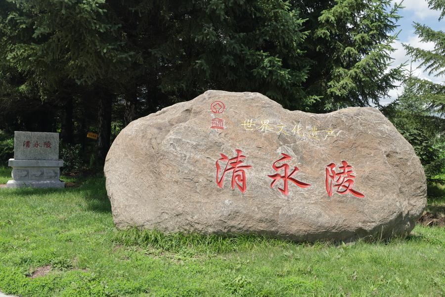 永陵参道の入口にある世界文化遺産の標識。(2025年7月4日撮影、撫順=新華社記者/藍建中)