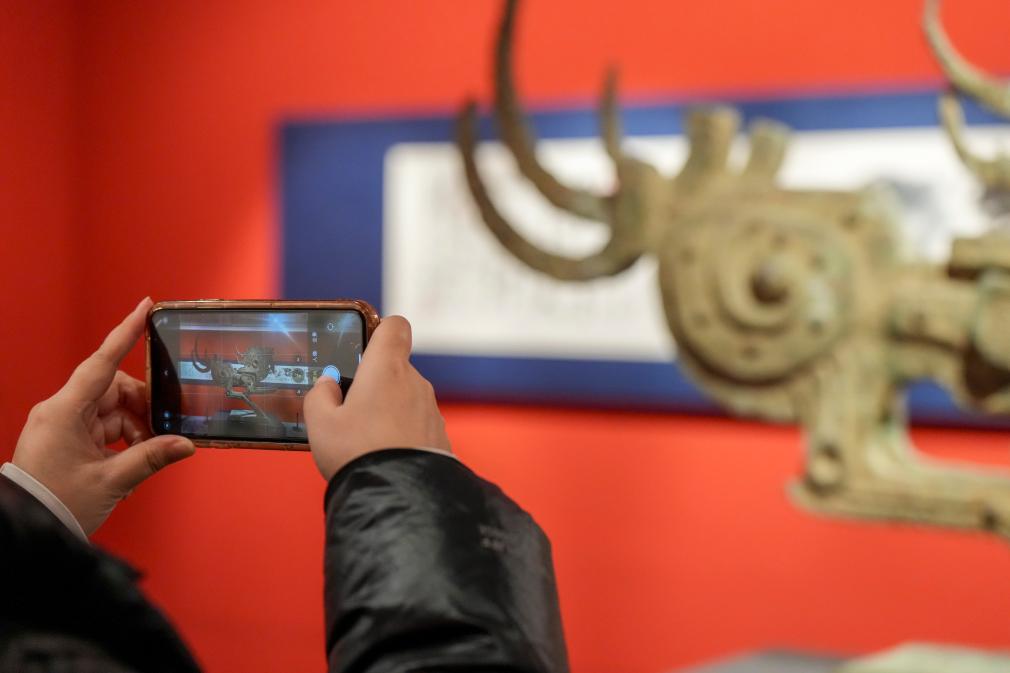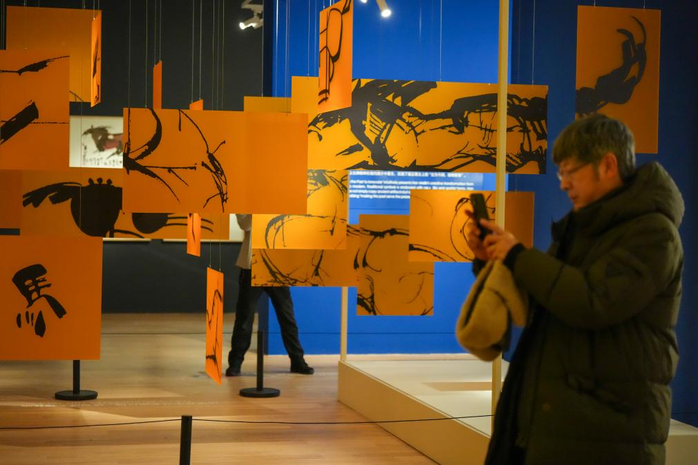 22日、ハルビン市博物館で韓美林馬年芸術展の展示品を撮影する来館者。(ハルビン=新華社記者/王松)
