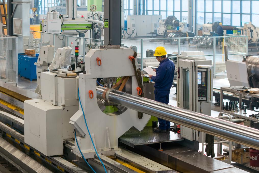 14日、油圧シリンダーメーカーの湖南特力液圧で、大型シリンダーを製造する従業員。(ドローンから、長沙=新華社記者/陳思汗)