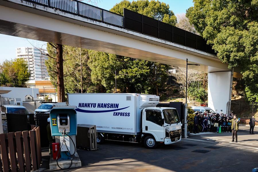 27日、シャオシャオとレイレイを乗せ、上野動物園を出発したトラック。(東京=新華社記者/賈浩成)