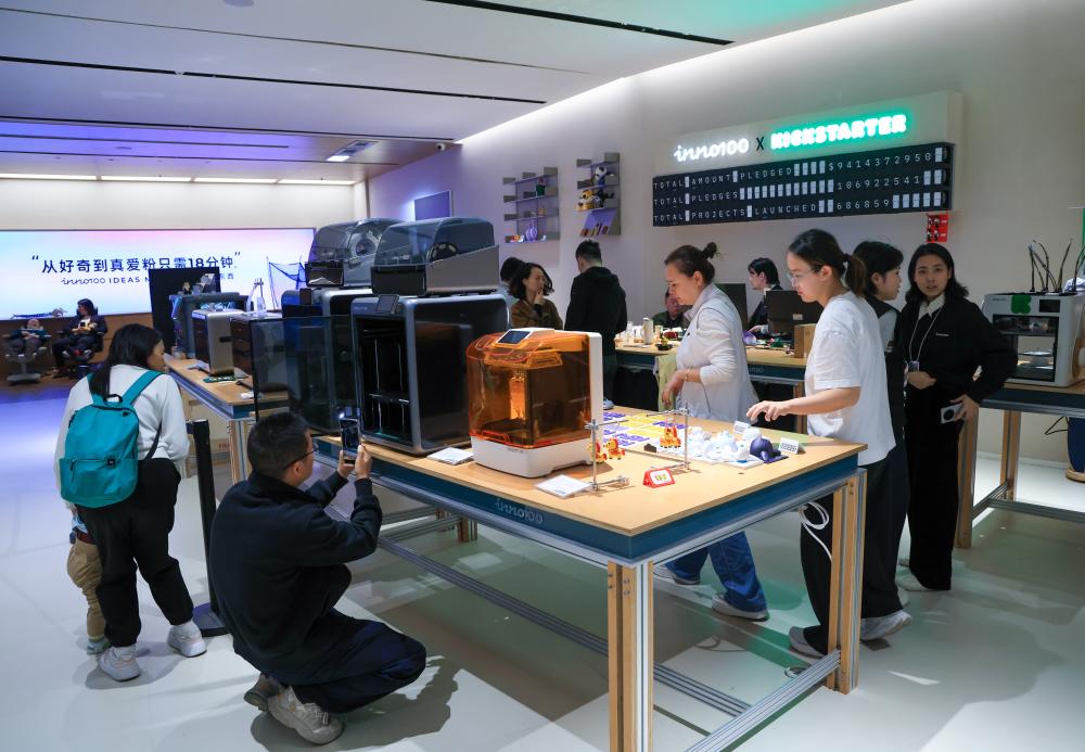 18日、深圳市南山区にあるINNO100世界イノベーション旗艦店の「万物カスタマイズワークステーション」で、3Dプリンターの動作を見つめる客。(深圳=新華社記者/毛思倩)