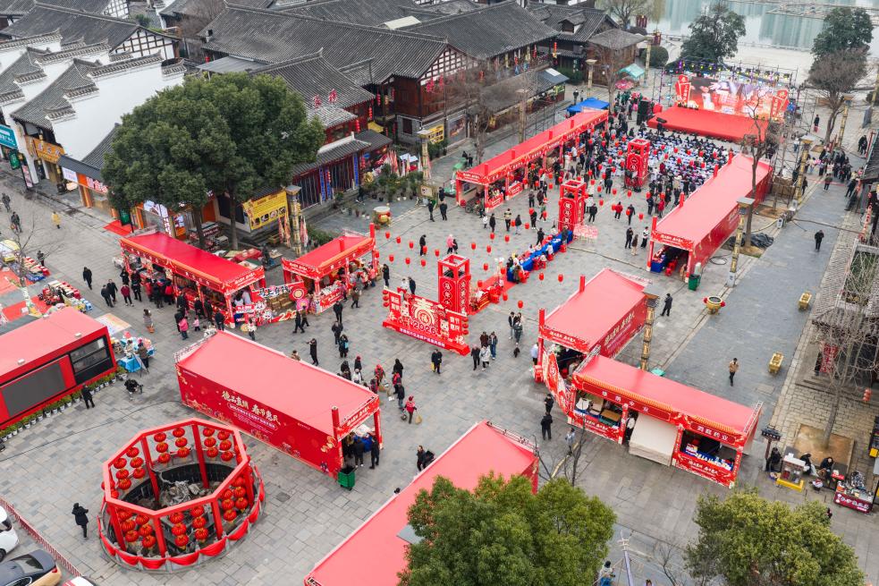 24日、深紅の飾り付けで春節の雰囲気に包まれる河街春秋広場。(常徳=新華社記者/陳思汗)