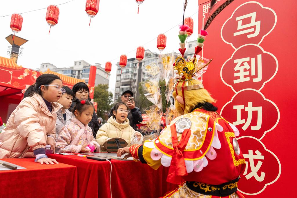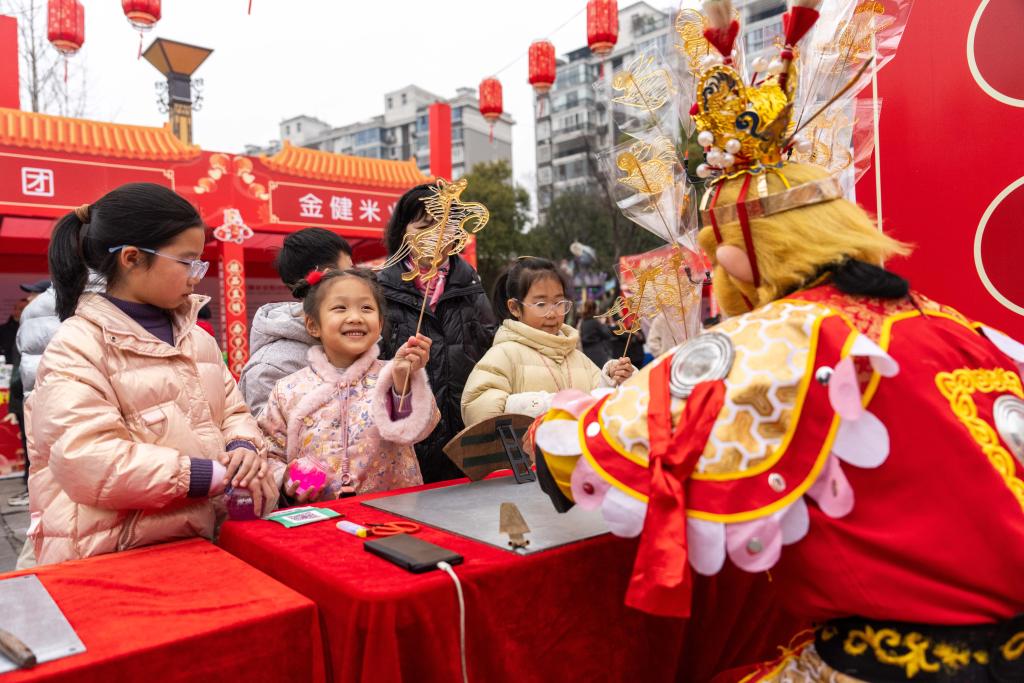 24日、河街春秋広場で、糖画(べっ甲あめ細工)を買い求める子どもたち。(常徳=新華社記者/陳思汗)