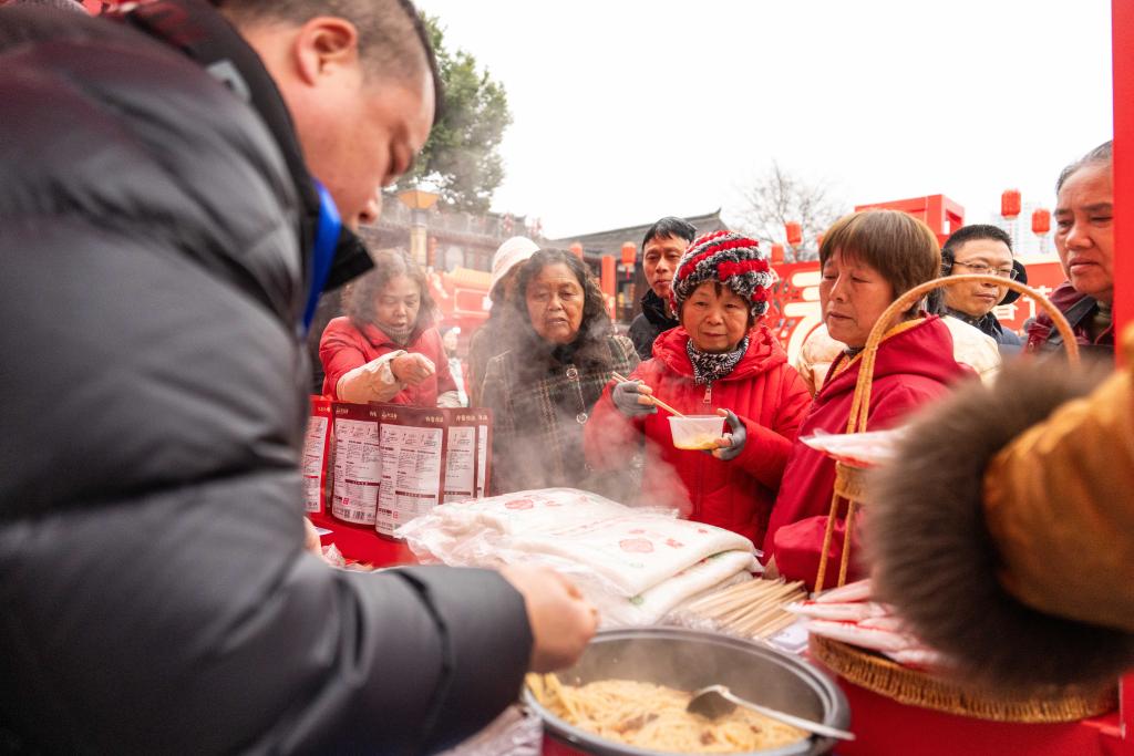 24日、河街春秋広場で行われた米粉(ビーフン)の試食。(常徳=新華社記者/陳思汗)