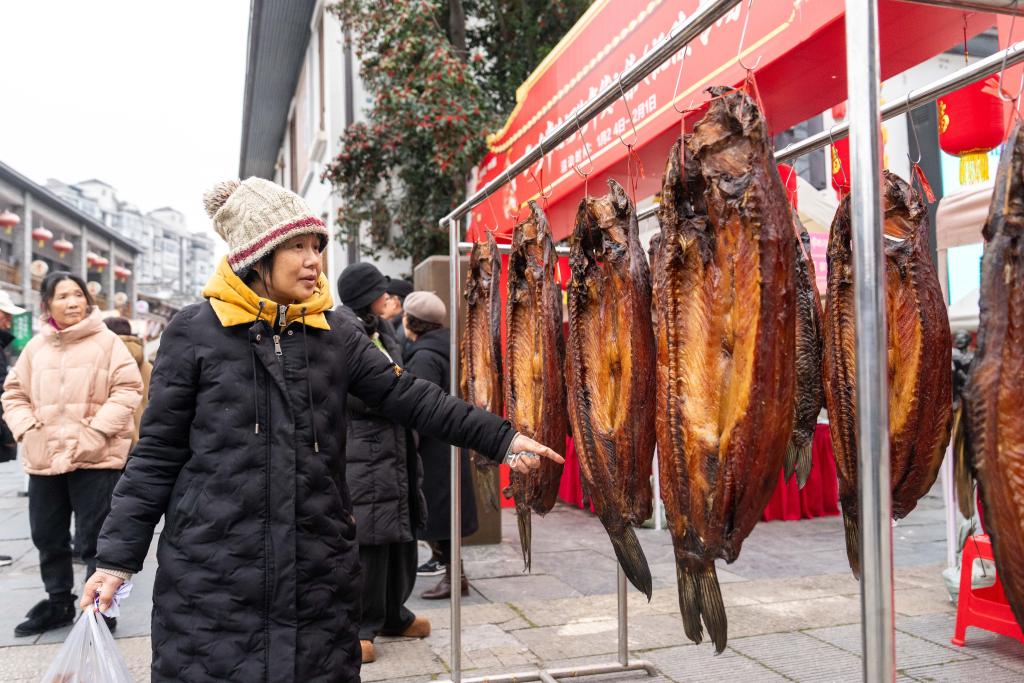 24日、河街春秋広場で燻製(くんせい)食品を買い求める市民。(常徳=新華社記者/陳思汗)