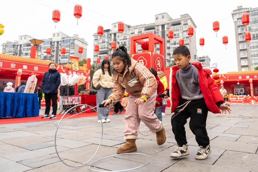 24日、河街春秋広場で、輪回し遊びを体験する子ども。(常徳=新華社記者/陳思汗)