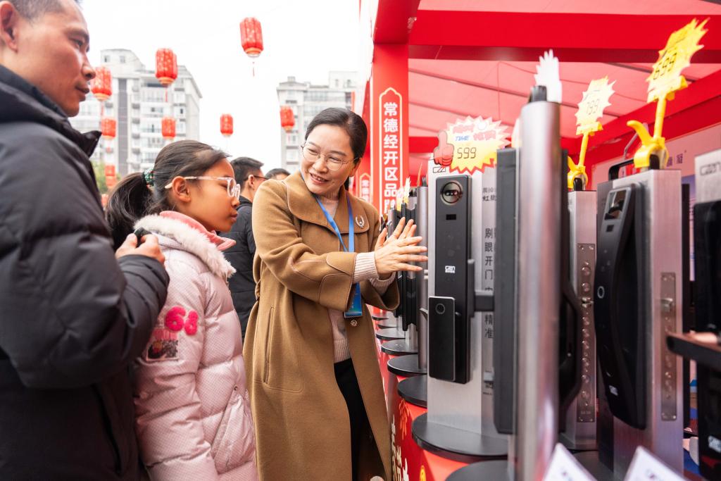 24日、河街春秋広場で行われたスマートドアロックの展示販売。(常徳=新華社記者/陳思汗)