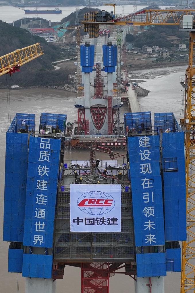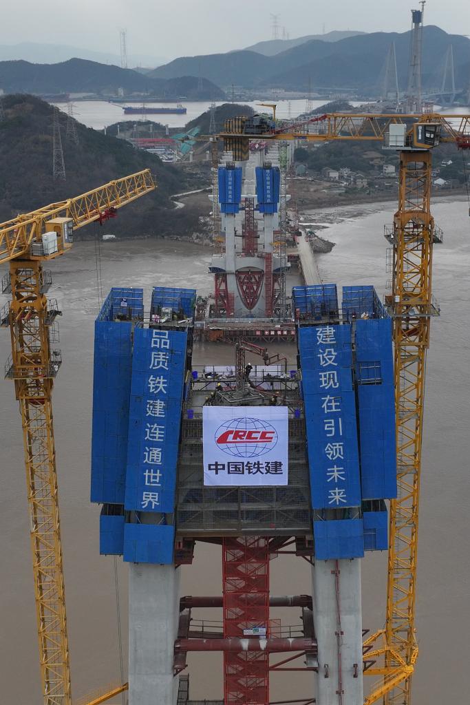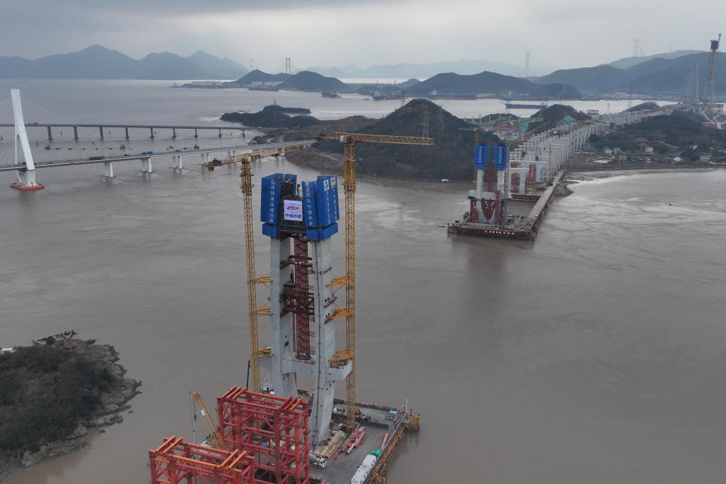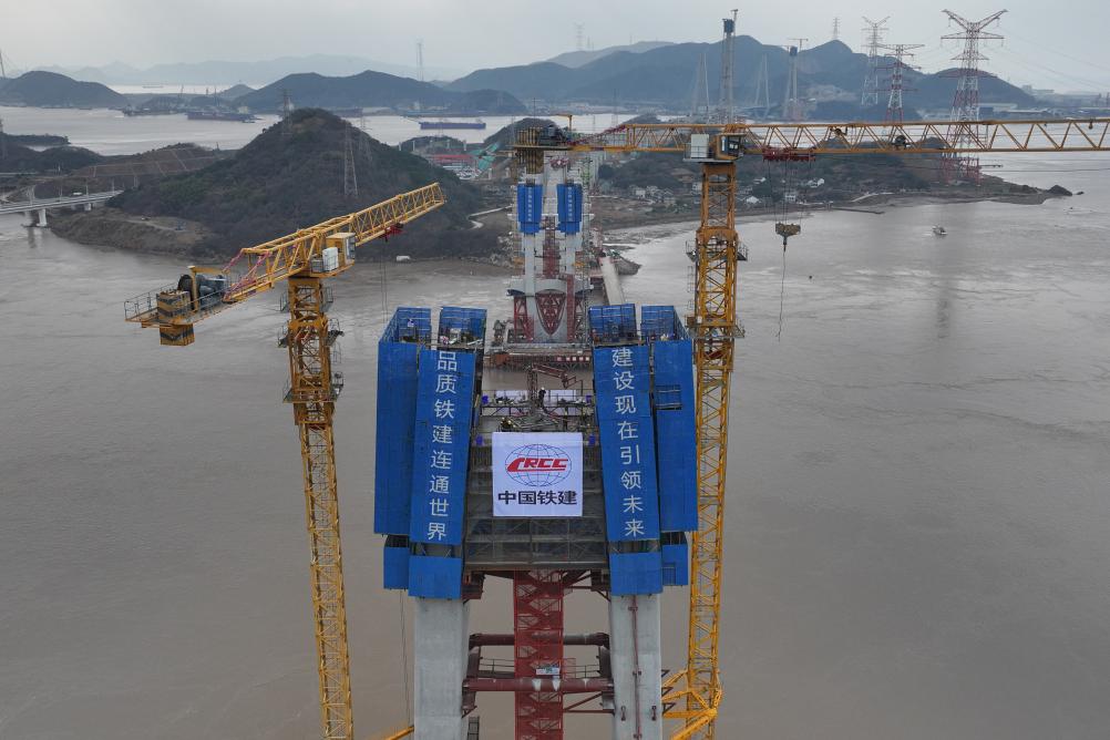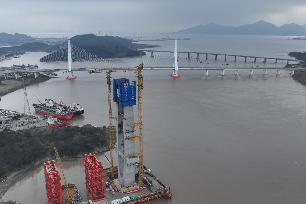 【新華社舟山1月28日】中国浙江省舟山市で建設が進む甬舟(ようしゅう)鉄道(同省寧波市-舟山市)の富翅門(ふしもん)鉄道道路併用大橋で25日、東側主塔上部横梁のコンクリート打設が完了した。主塔本体の建設が大きく進み、今後予定されている頂部や橋面の施工に向けた基礎を築いた。作業はインフラ建設大手の中国鉄建大橋工程局集団が担っている。