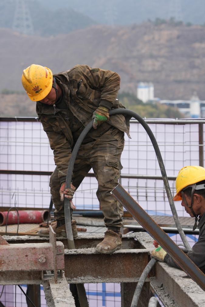 25日、富翅門鉄道道路併用大橋・東側主塔上部横梁のコンクリート打設を行う作業員。(舟山=新華社記者/黄宗治)