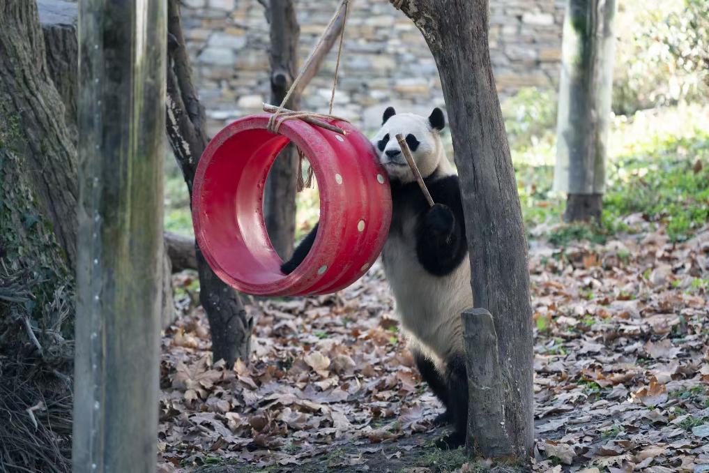 遊具からタケノコを取り出す福宝。(2025年12月11日撮影、成都=新華社配信/Panda365提供)