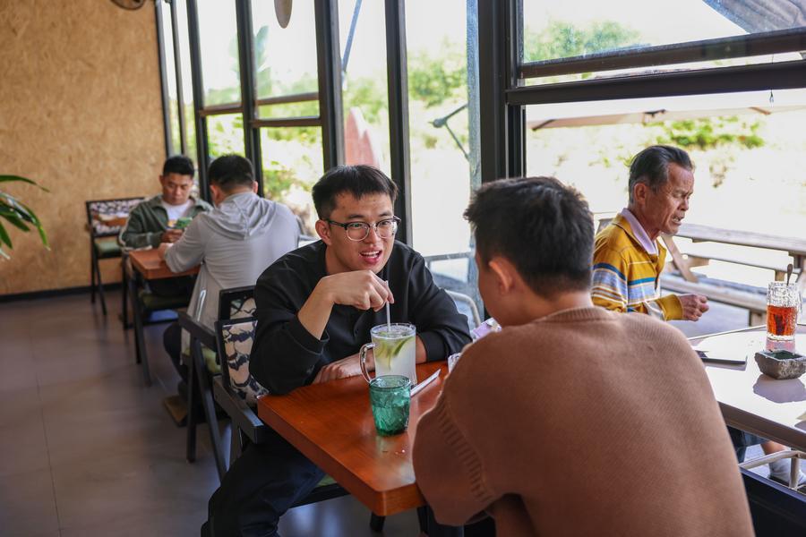 27日、海南省定安県富文鎮の穀倉カフェでくつろぐ客。(定安=新華社記者/張麗蕓)
