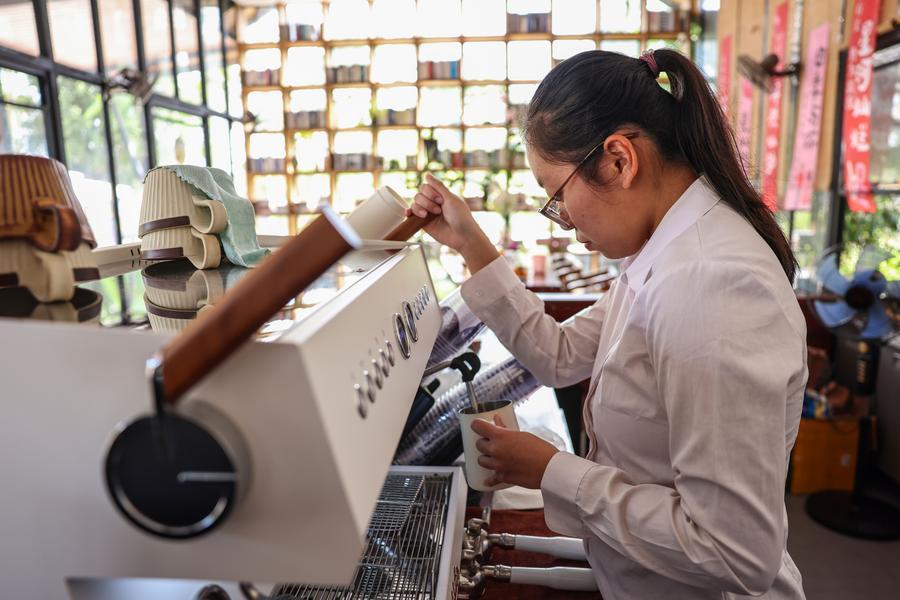27日、海南省定安県富文鎮の九所会客庁水塔カフェでコーヒーを入れる店員。(定安=新華社記者/張麗蕓)