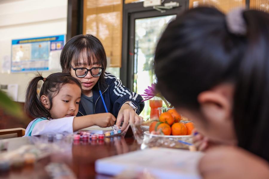 27日、海南省定安県富文鎮の九所会客庁水塔カフェで、絵画教室に参加した子ども。(定安=新華社記者/張麗蕓)