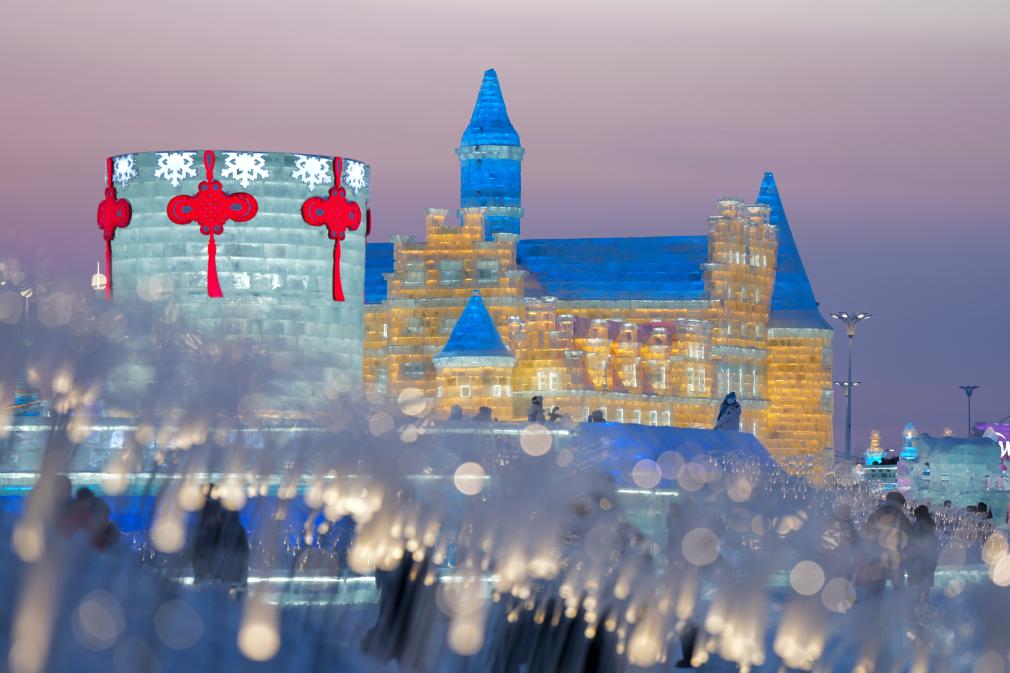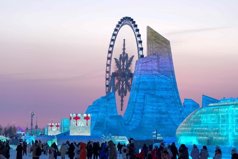【新華社ハルビン1月29日】中国黒竜江省ハルビン市の氷雪テーマパーク「ハルビン氷雪大世界」は会場がライトアップされ、夕方以降も観光客でにぎわっている。