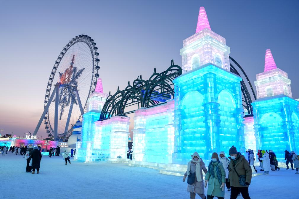 27日、ライトアップされたハルビン氷雪大世界を散策する観光客。(ハルビン=新華社記者/王松)
