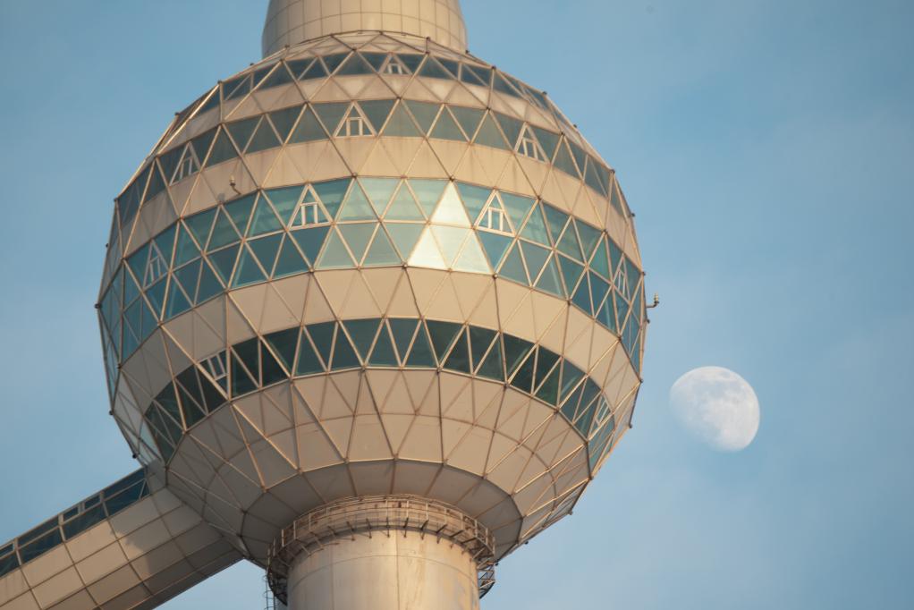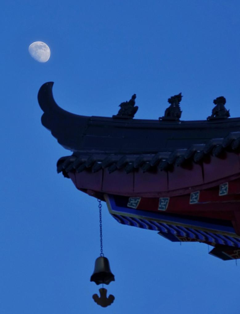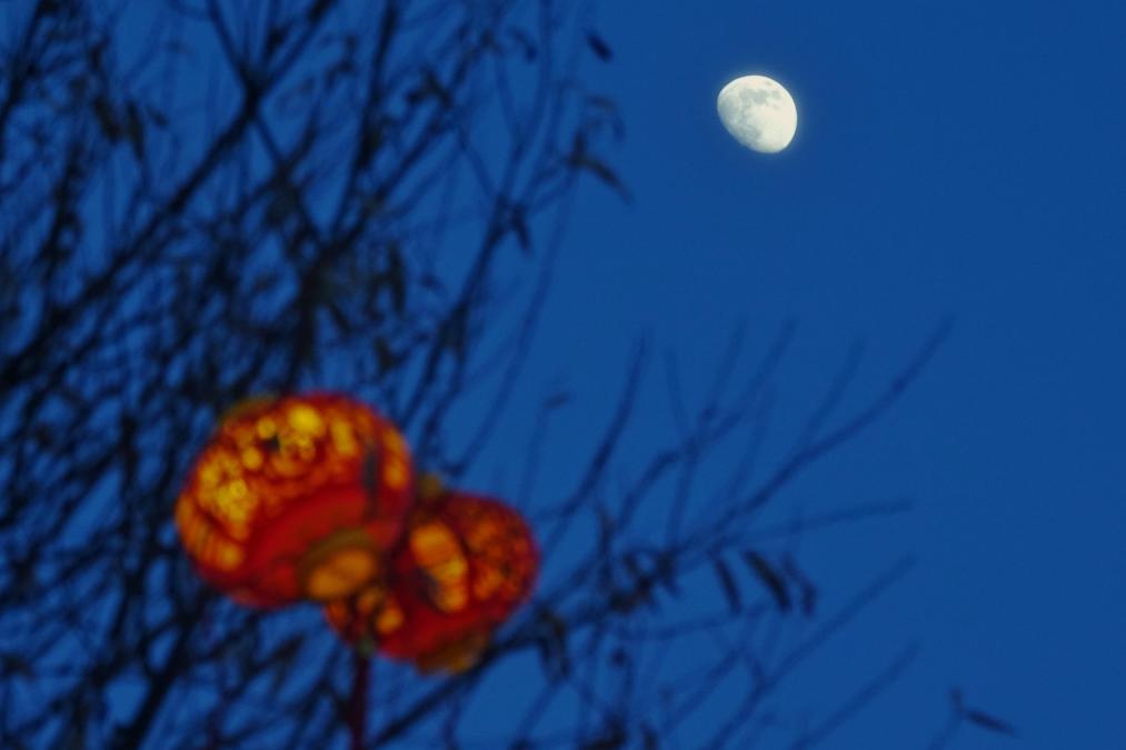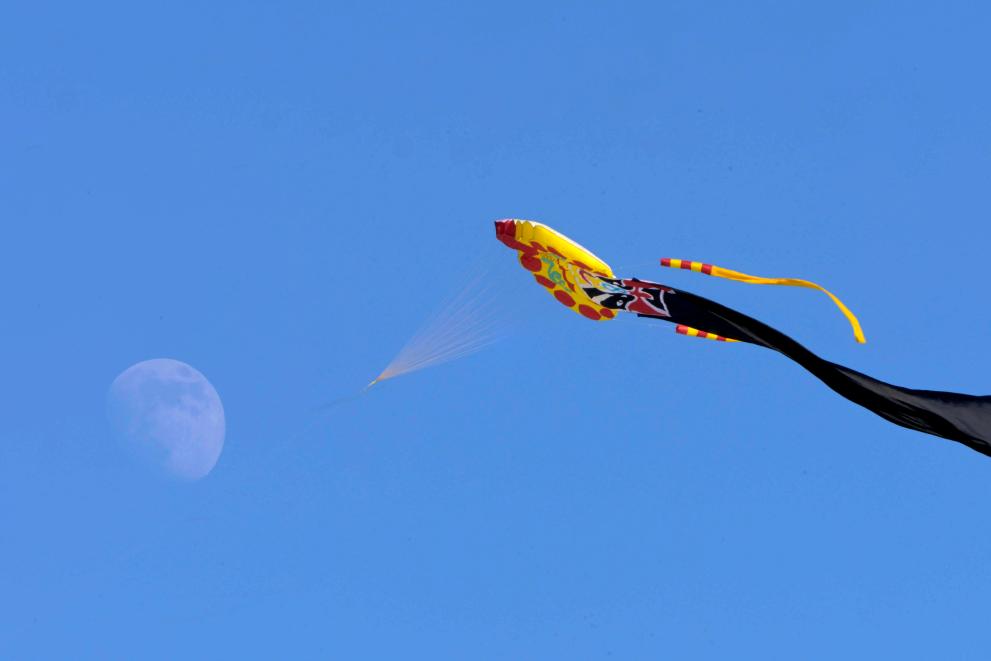 29日、黒竜江省チチハル市での空に昇った月とたこ。(ハルビン=新華社配信/王勇剛)