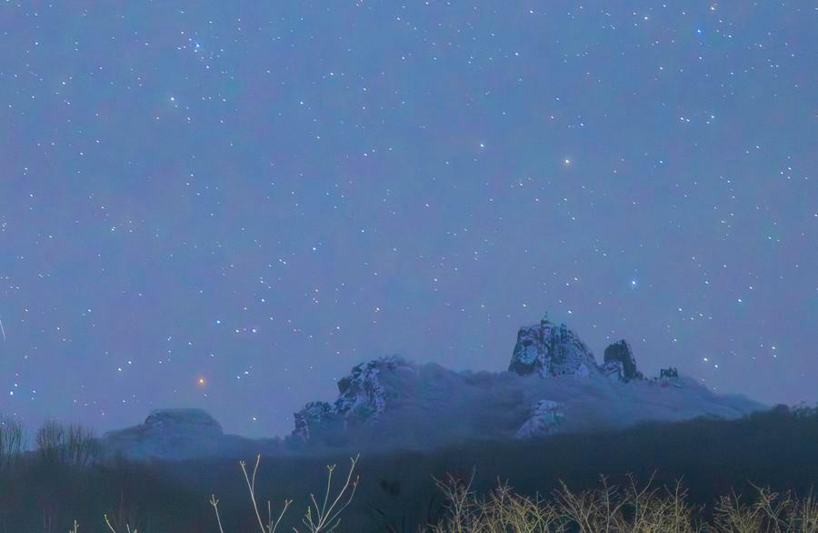 24日、黒竜江省富錦市で撮影した夜空に輝く「冬の大三角」とオリオン座。(ハルビン=新華社配信/曲玉宝)