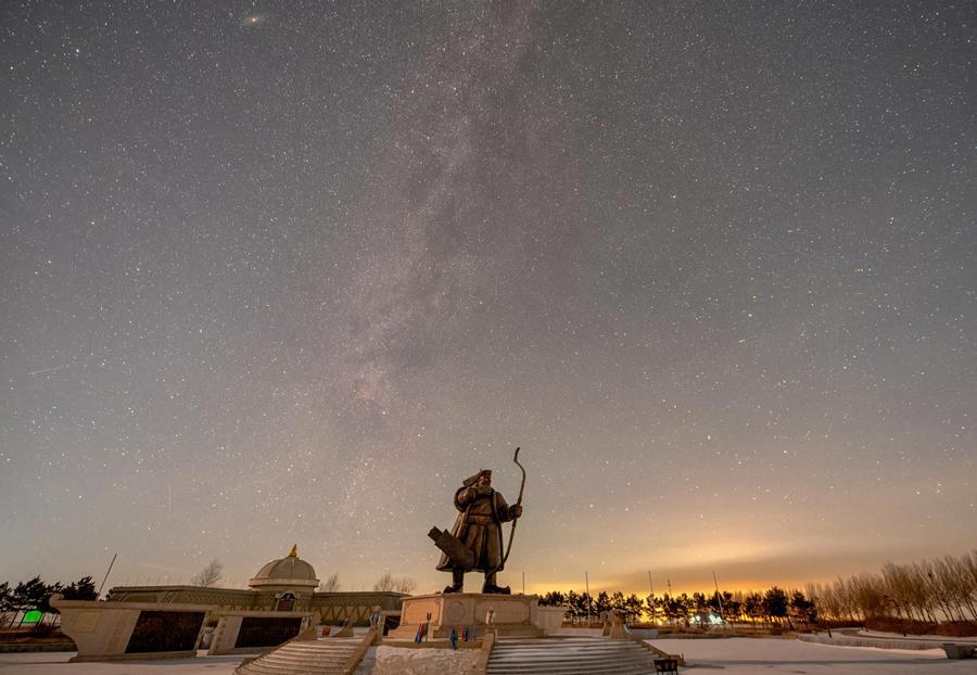 23日、黒竜江省大慶市ドルボド・モンゴル族自治県の阿木塔観光リゾートで撮影した冬の天の川とアンドロメダ銀河。(比較明合成写真、ハルビン=新華社配信/劉崴)
