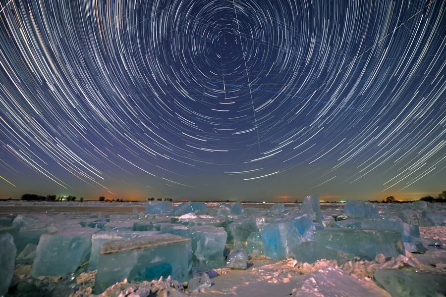 24日、黒竜江省チチハル市の嫩江採氷場で撮影した星空。(比較明合成写真、ハルビン=新華社配信/王勇剛)