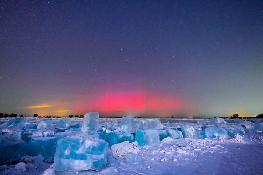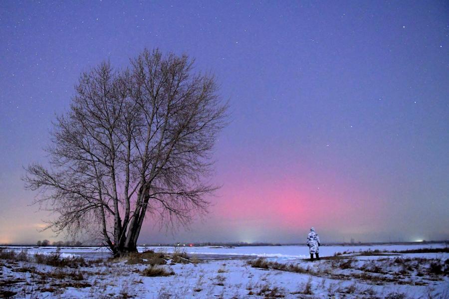 20日、黒竜江省チチハル市の嫩江採氷場で撮影したオーロラ。(ハルビン=新華社配信/王勇剛)