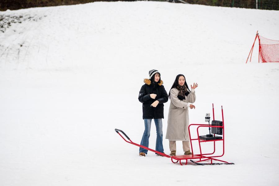 30日、氷雪カーニバルイベントでダンス動画を撮影する観光客。(重慶=新華社記者/唐奕)