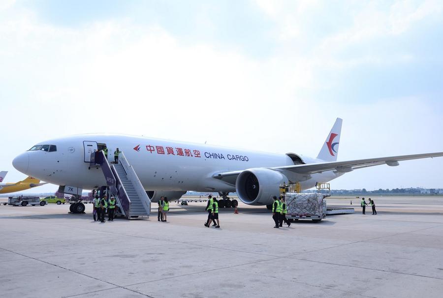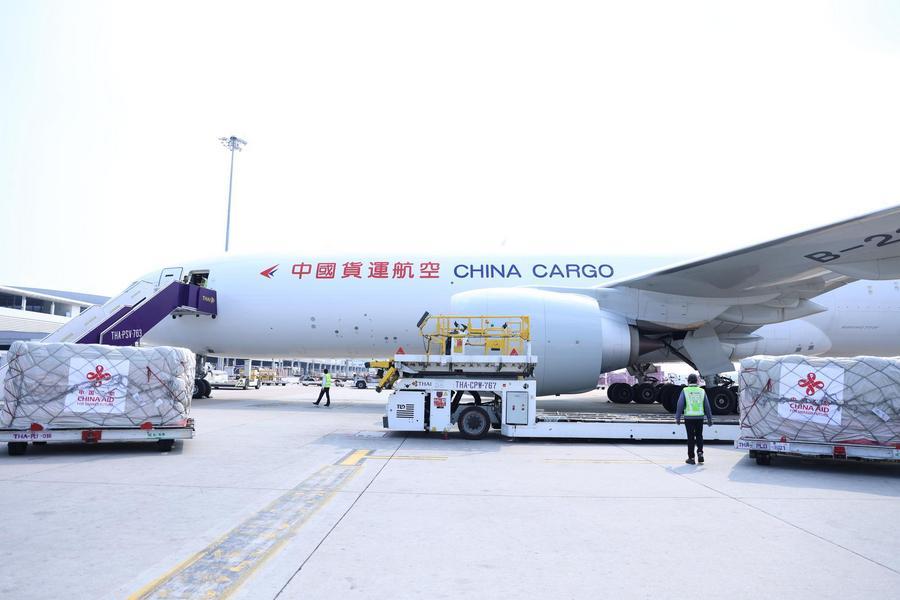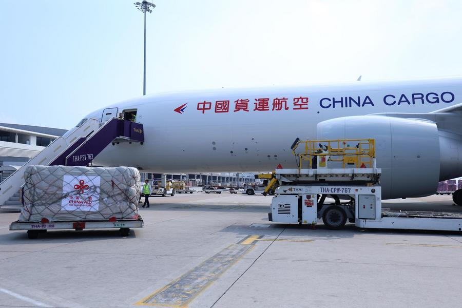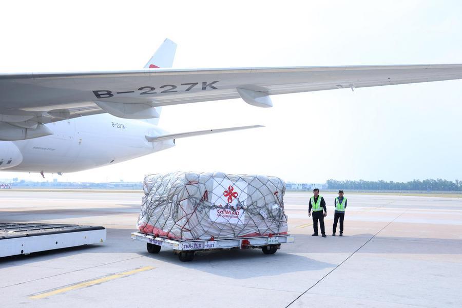 30日、タイ・バンコクのスワンナプーム国際空港に到着した中国政府の人道支援物資第1陣。(バンコク=新華社記者/劉楊)
