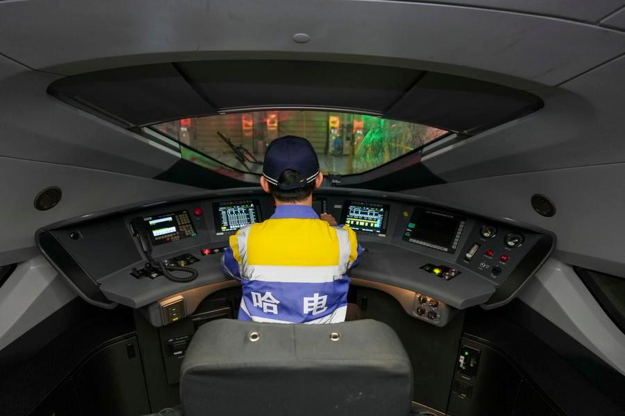 1月31日、運転室で動車組に搭載されたATPを点検する職員。(ハルビン=新華社記者/王松)