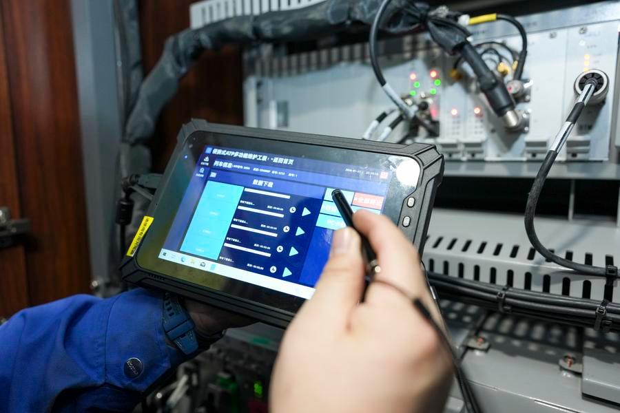 1月31日、動車組に搭載されたATPを点検する職員。(ハルビン=新華社記者/王松)