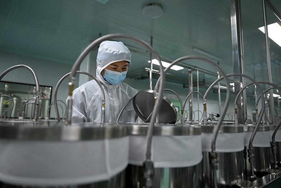 1月27日、中国(濮陽)・エチオピアコーヒー産業モデルパークの凍結乾燥工場で、ろ過されるコーヒー液。(鄭州=新華社記者/郝源)
