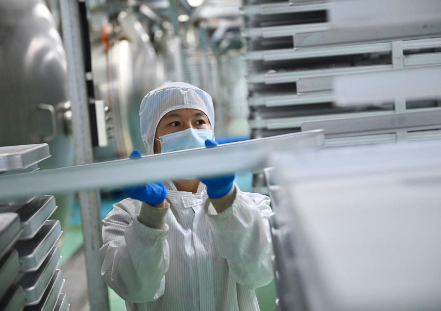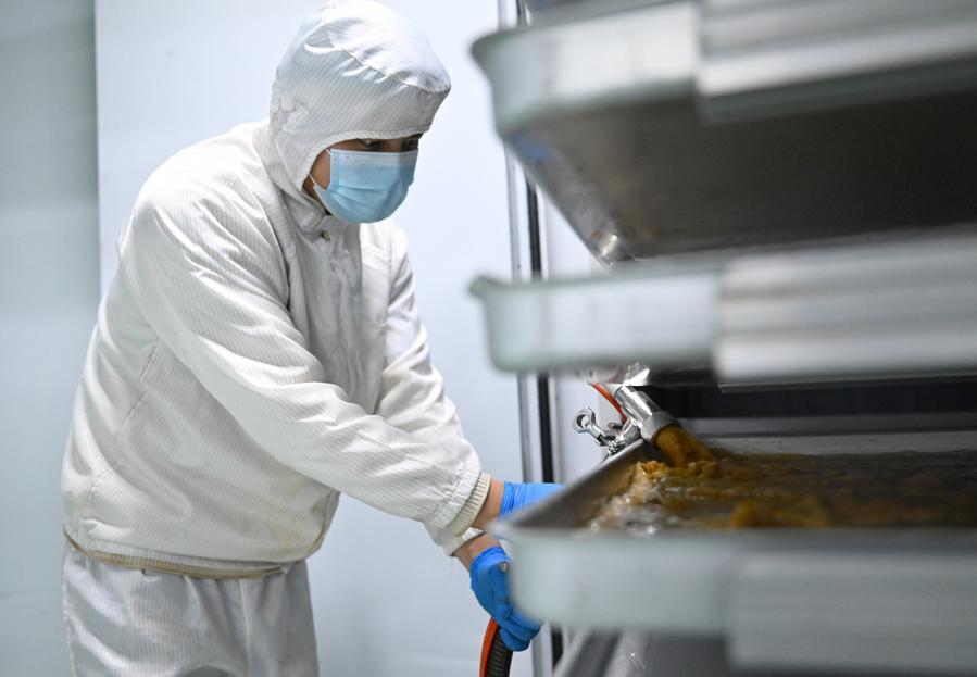 1月27日、中国(濮陽)・エチオピアコーヒー産業モデルパークの凍結乾燥工場で、コーヒー液をトレーに入れる従業員。(鄭州=新華社記者/郝源)