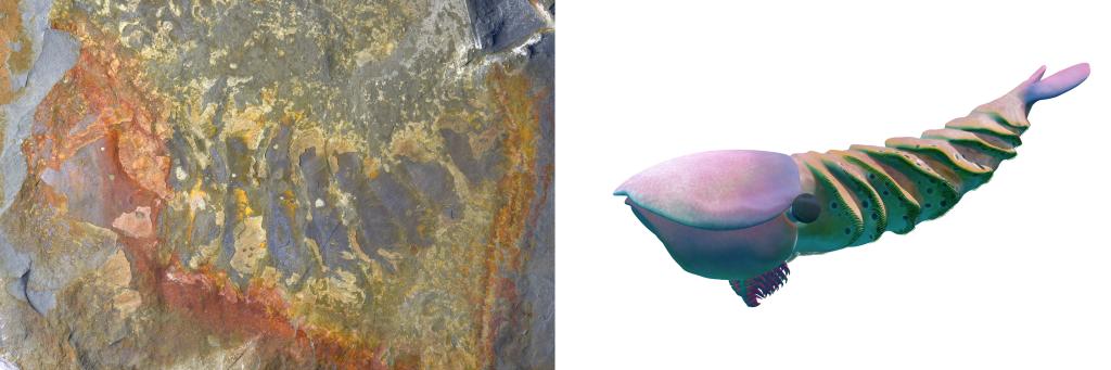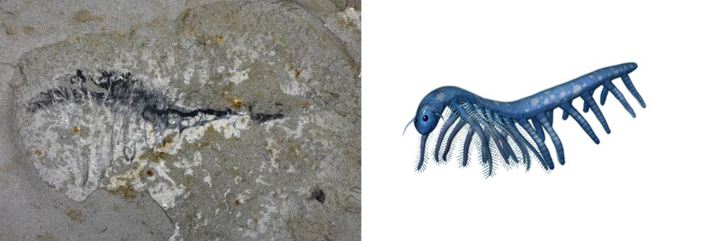 「花垣生物群」の葉足動物、「コリンズ・モンスター」とみられる化石(左)と復元図。(南京=新華社配信)