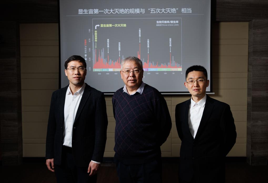 1月22日、中国科学院南京地質古生物研究所の実験室で写真撮影に応じる(左から)趙方臣(ちょう・ほうしん)研究員、朱茂炎研究員、曽晗(そ・かん)副研究員。(南京=新華社記者/金立旺)