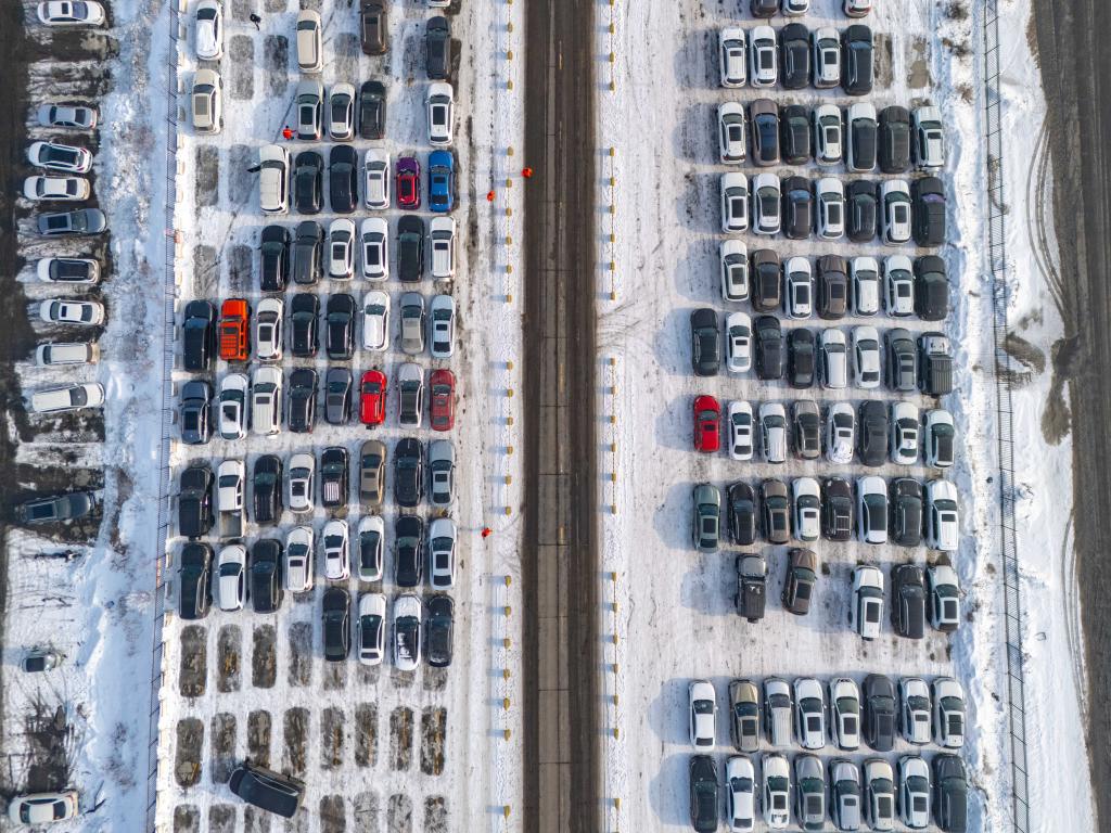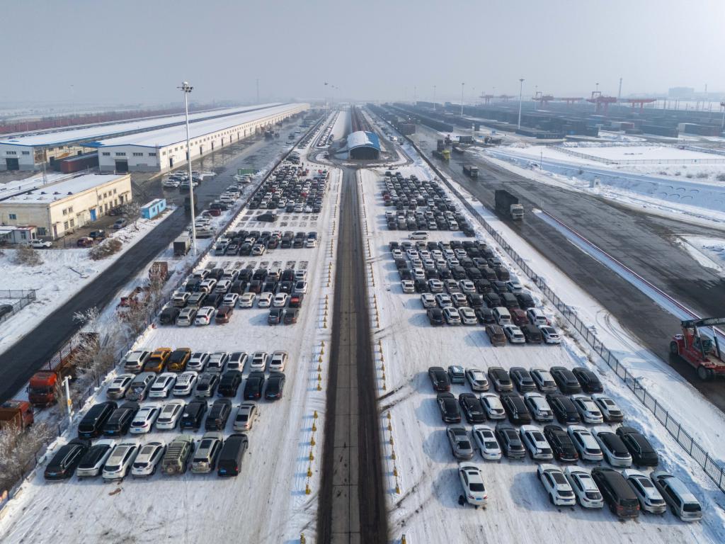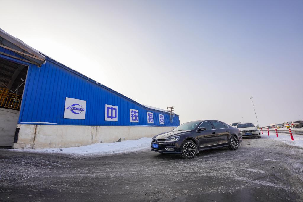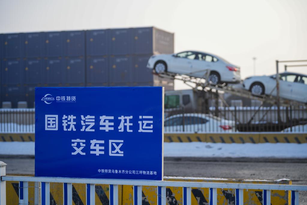 1月31日、新疆ウイグル自治区ウルムチ市の中鉄特貨物流ウルムチ分公司三坪物流基地にある、中国国家鉄路(国鉄)自動車輸送引き渡しエリア。(ウルムチ=新華社記者/徐宏岩)