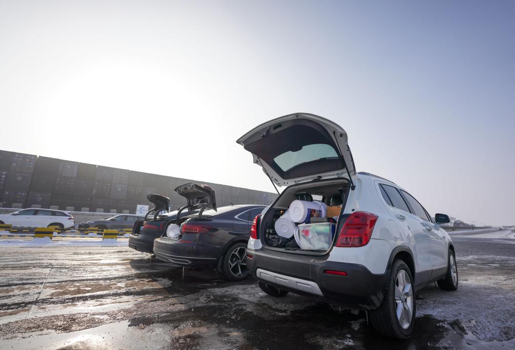 1月31日、新疆ウイグル自治区ウルムチ市にある中鉄特貨物流ウルムチ分公司の三坪物流基地で、保安検査を待つ車両。(ウルムチ=新華社記者/徐宏岩)