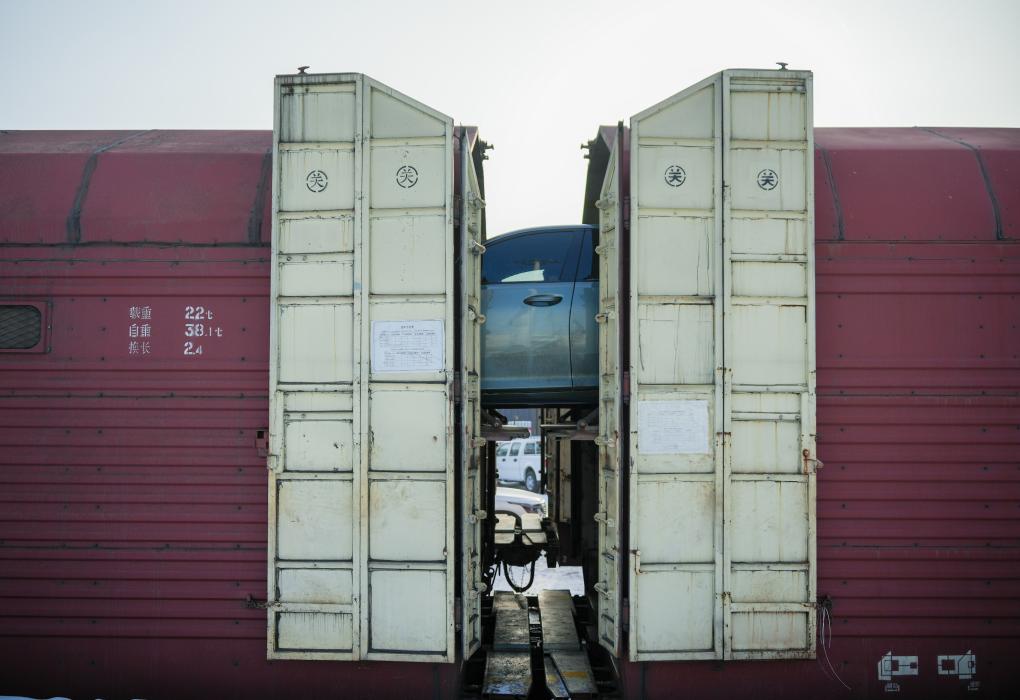 1月31日、新疆ウイグル自治区ウルムチ市にある中鉄特貨物流ウルムチ分公司の三坪物流基地で、列車内を移動する車両。(ウルムチ=新華社記者/徐宏岩)