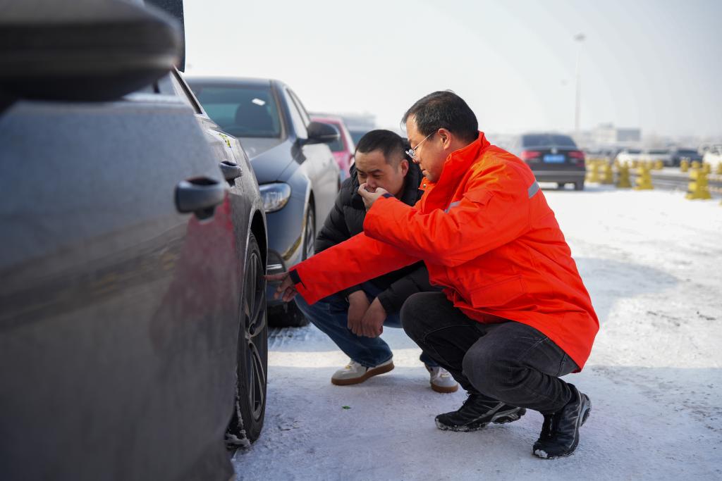 1月31日、新疆ウイグル自治区ウルムチ市にある中鉄特貨物流ウルムチ分公司の三坪物流基地で、利用者の黄さんと一緒に車両の状態を確認する係員。(ウルムチ=新華社記者/徐宏岩)
